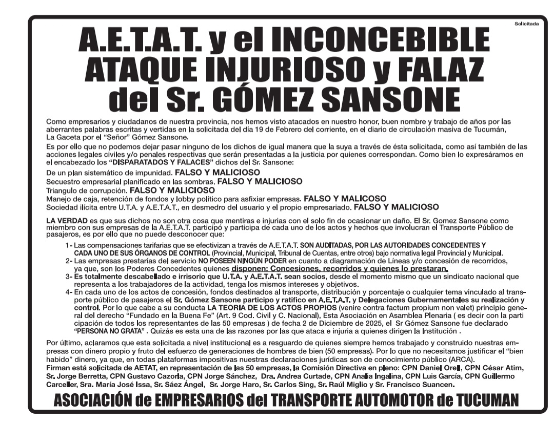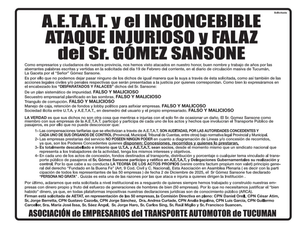 La Asociación de Empresarios del Transporte Automotor de Tucumán (AETAT) publicó un duro comunicado en el que rechazó las acusaciones formuladas por el dirigente Sergio Gómez Sansone y calificó sus declaraciones como un “inconcebible ataque injurioso y falaz”. En el documento, la entidad sostuvo que las expresiones del dirigente contienen “aberrantes palabras escritas y vertidas en la solicitud del día 19 de febrero”, y aseguró que sus afirmaciones son “disparatadas, falsas y maliciosas”.