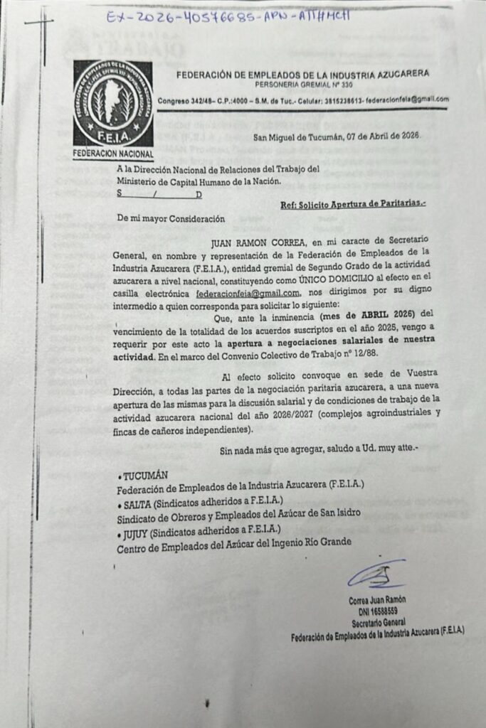 La Federación de Empleados de la Industria Azucarera (FEIA) presentó una nota ante la Dirección Nacional de Relaciones del Trabajo del Ministerio de Capital Humano de la Nación solicitando la apertura de paritarias para la actividad. El pedido se fundamenta en la inminente finalización de los acuerdos salariales firmados durante 2025.