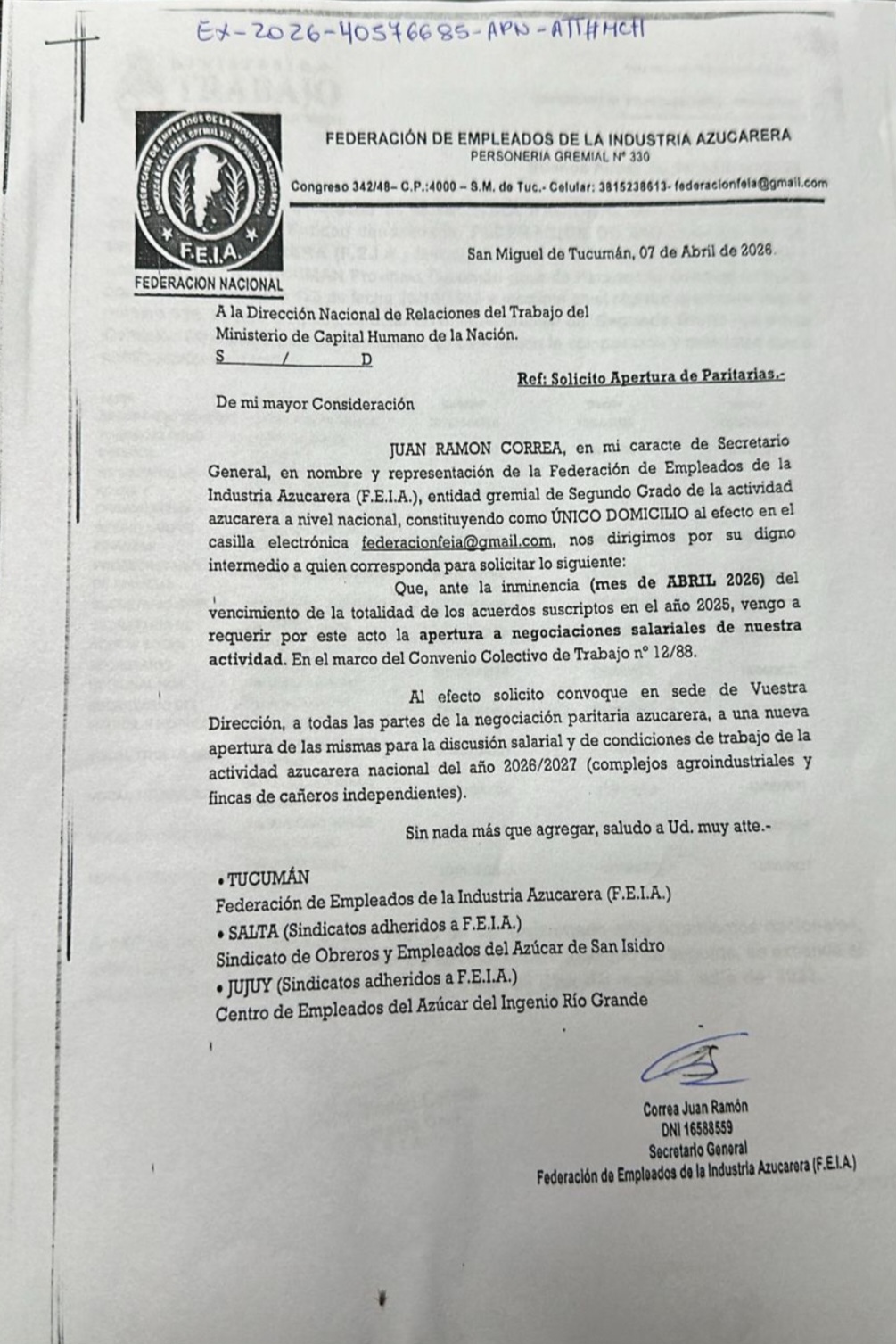 El documento, fechado el 7 de abril de 2026 en San Miguel de Tucumán y firmado por el secretario general Juan Ramón Correa, plantea la necesidad de iniciar negociaciones salariales en el marco del Convenio Colectivo de Trabajo N° 12/88, que regula la actividad azucarera a nivel nacional.
