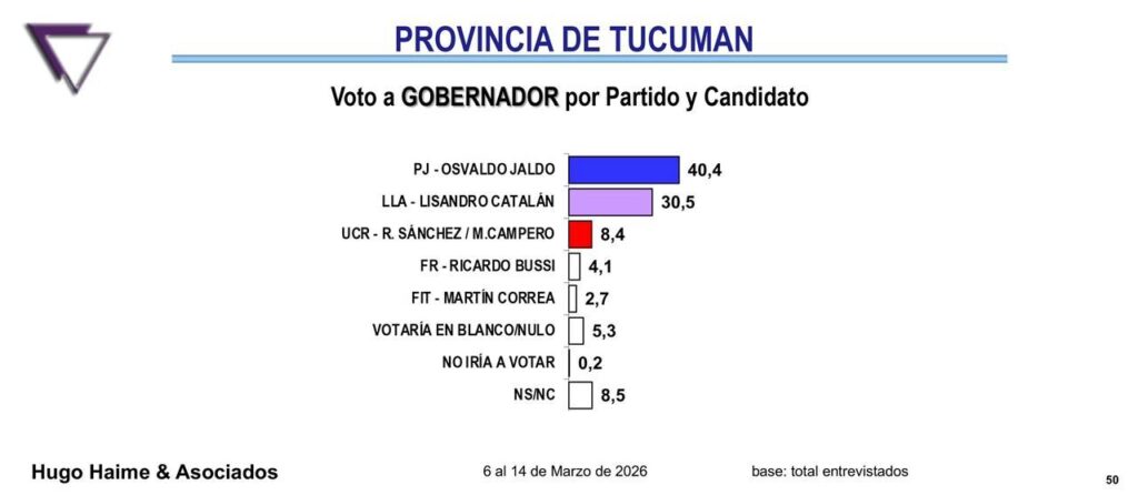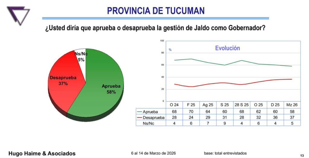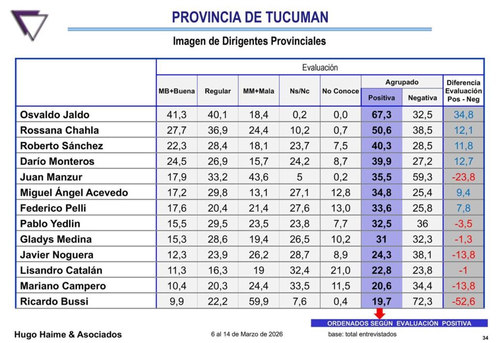 Una encuesta reciente realizada en la Provincia de Tucumán posiciona al gobernador Osvaldo Jaldo como el principal referente político del distrito, con una imagen positiva que alcanza el 67,3%. El estudio, elaborado entre el 6 y el 14 de marzo de 2026, también refleja que el Partido Justicialista (PJ) se mantiene al frente en intención de voto. De acuerdo al informe, la gestión de Jaldo registra un 58% de aprobación, frente a un 37% de desaprobación y un 5% de indecisos.