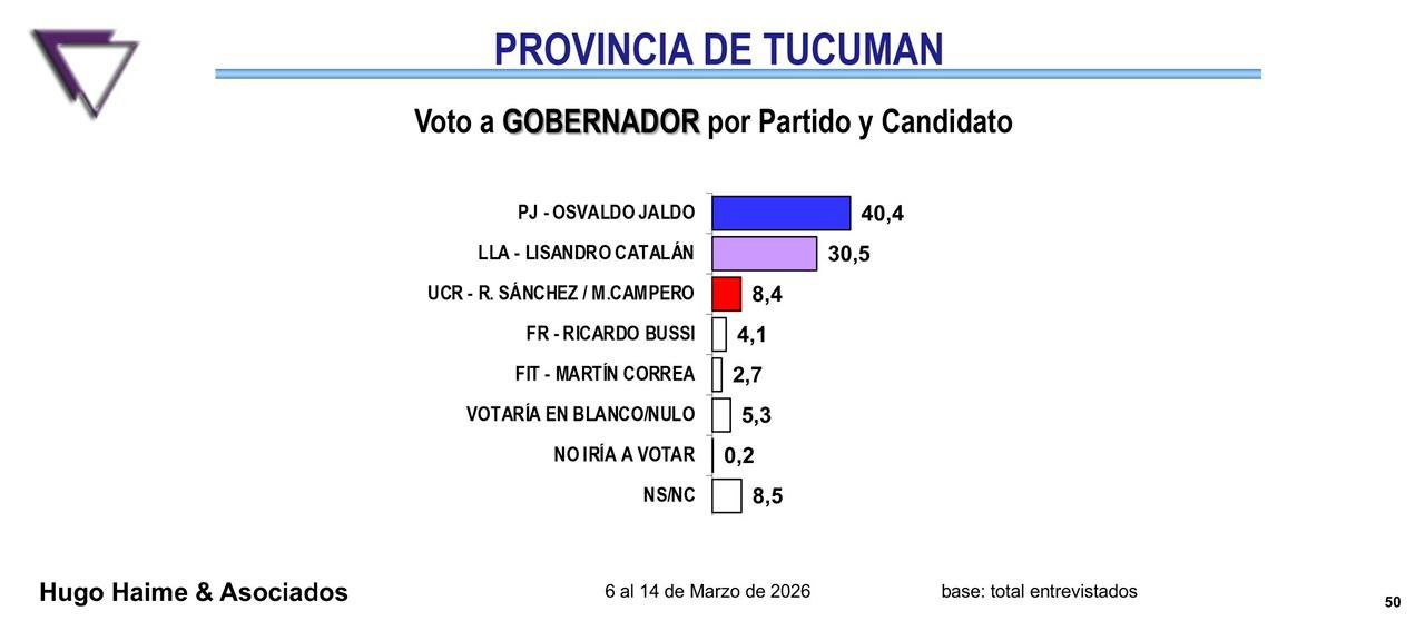 En cuanto a la imagen de dirigentes provinciales, Jaldo encabeza el ranking con una valoración positiva del 67,3%, seguido por la intendenta Rossana Chahla, con el 50,6%. Más atrás aparecen Roberto Sánchez (40,3%) y Darío Monteros (39,9%). En contraste, el exgobernador Juan Manzur presenta un diferencial negativo en su imagen.El relevamiento también midió intención de voto para gobernador por espacio político.