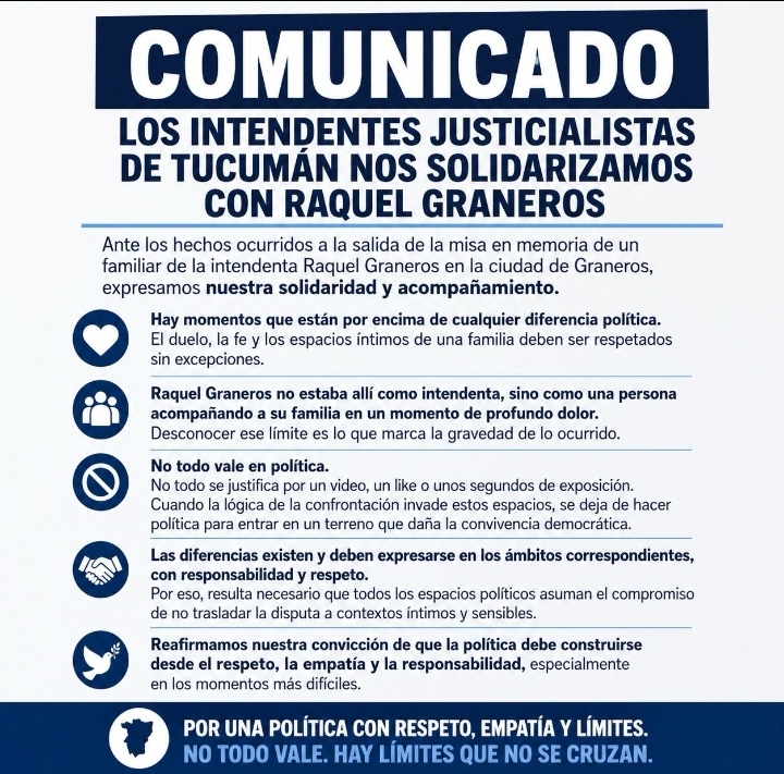 Los intendentes justicialistas de Tucumán difundieron un comunicado en el que manifestaron su solidaridad con la intendenta de Graneros, Raquel Graneros, luego de los hechos ocurridos a la salida de una misa en memoria de un familiar fallecido. En el texto, los jefes municipales señalaron que existen momentos que deben estar “por encima de cualquier diferencia política”, y subrayaron que el duelo, la fe y los espacios íntimos de una familia deben ser respetados sin excepciones.