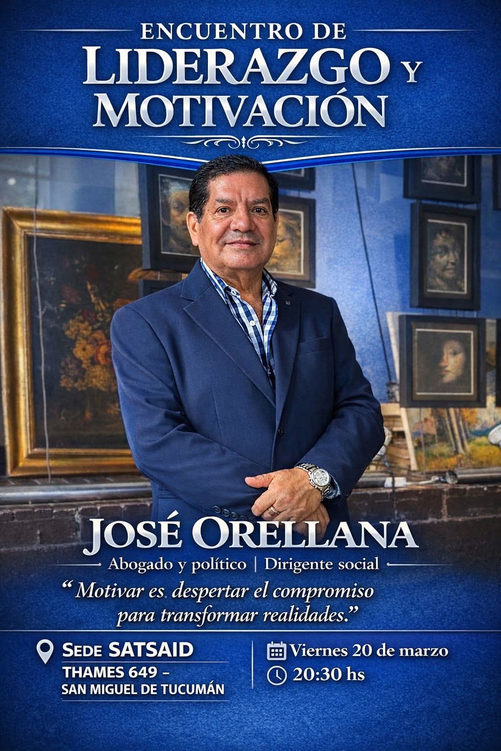Este viernes 20, a las 20:30 horas, se llevará a cabo en San Miguel de Tucumán el “Encuentro de Liderazgo y Motivación”, una propuesta orientada a compartir experiencias, fortalecer valores y promover el compromiso social. La actividad tendrá lugar en la sede de SATSATID, ubicada en calle Thames 649.El evento contará con la participación de José Orellana, abogado, dirigente social y referente político, quien será el principal expositor de la jornada. Bajo el lema “Motivar es despertar el compromiso para transformar realidades”, el encuentro buscará generar un espacio de intercambio y reflexión sobre el rol del liderazgo en la actualidad.