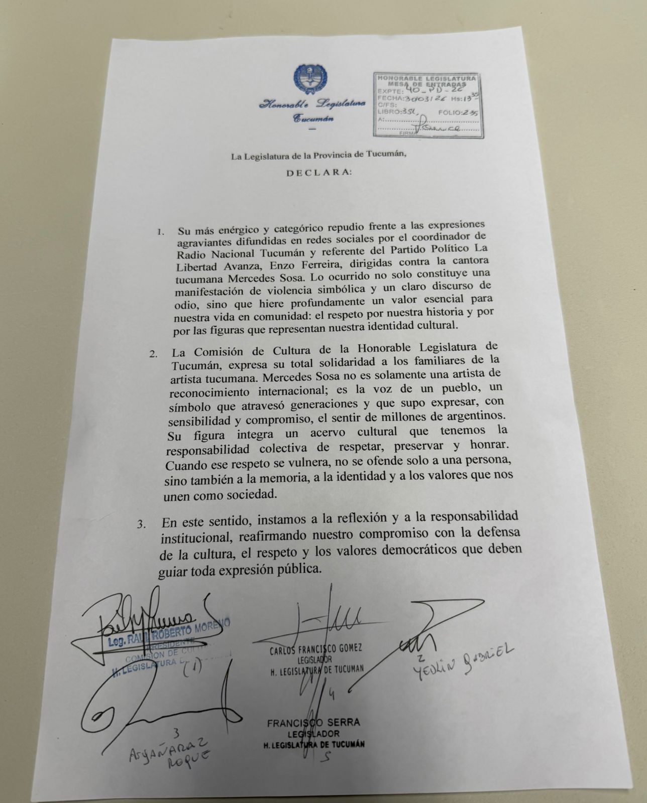 El documento destaca la figura de Mercedes Sosa como parte fundamental del patrimonio cultural de Tucumán y de la Argentina, subrayando la importancia de sostener el respeto como base del diálogo democrático. “Mercedes Sosa es Tucumán, es Argentina, es paz, es inclusión”, expresó el legislador Roberto Moreno, quien además llamó a promover la unidad y la convivencia en contextos sociales complejos.