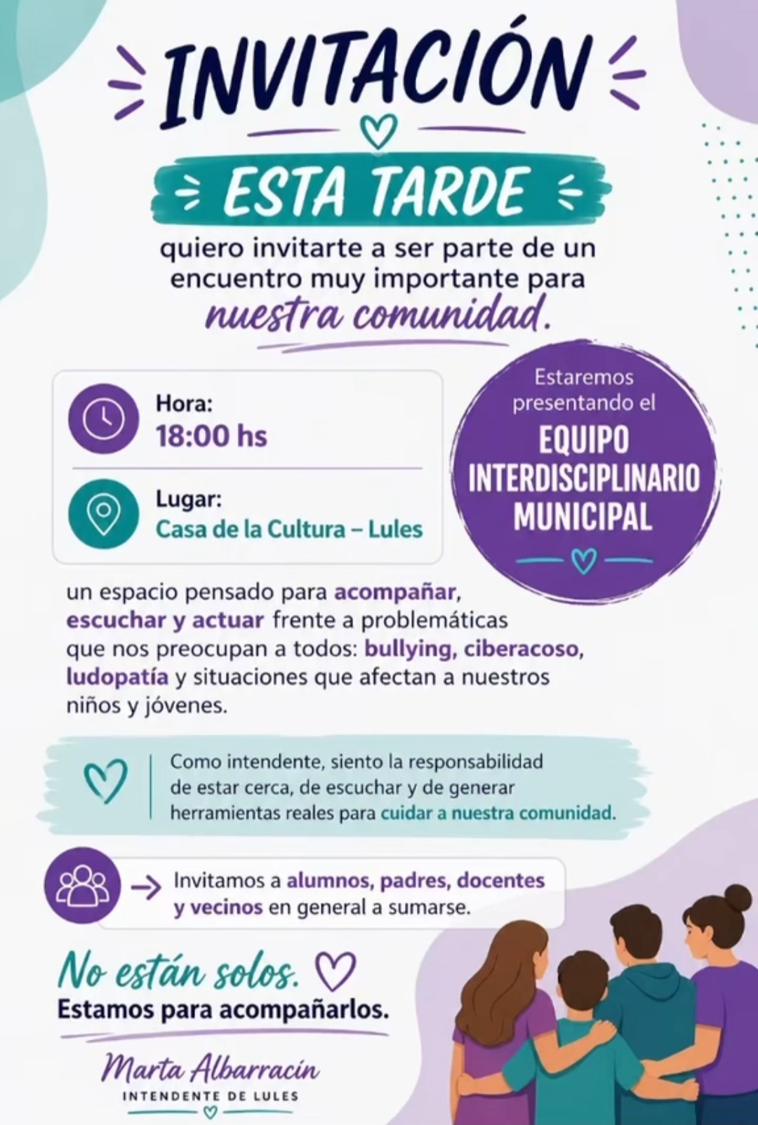 La intendenta de Lules, Marta Albarracín convocó a la comunidad de Lules a participar de un encuentro que se llevará a cabo hoy a las 18:00 en la Casa de la Cultura, donde se presentará oficialmente el Equipo Interdisciplinario Municipal.