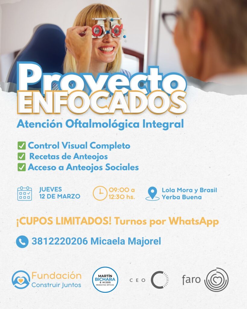 Este jueves 12 de marzo se llevará adelante una nueva jornada del “Proyecto Enfocados”, una iniciativa solidaria orientada a brindar atención oftalmológica integral a vecinos de Yerba Buena. La actividad se realizará de 9 a 12.30 horas en la intersección de Lola Mora y Brasil. Durante la jornada, los profesionales ofrecerán controles visuales completos, emitirán recetas de anteojos y brindarán asesoramiento para acceder a anteojos sociales, con el objetivo de facilitar soluciones accesibles para quienes presentan dificultades visuales.