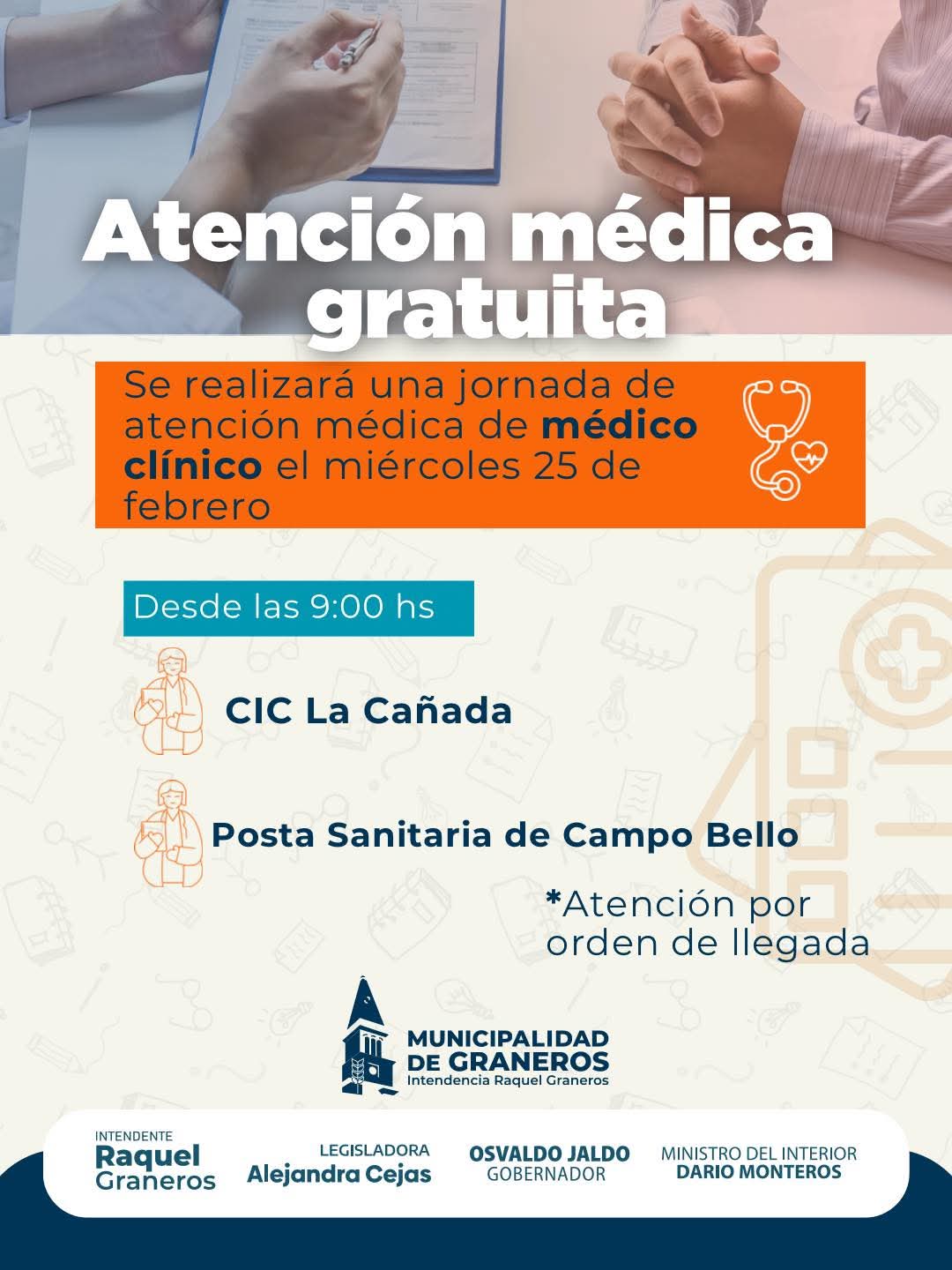 La Municipalidad de Graneros, bajo la gestión de la intendenta Raquel Graneros, anunció la realización de una nueva jornada de atención médica gratuita destinada a vecinos y vecinas de la comunidad. La iniciativa contará con la presencia de un médico clínico y se desarrollará el miércoles 25 de febrero a partir de las 9:00 horas en dos puntos estratégicos: el CIC La Cañada y la Posta Sanitaria de Campo Bello, con el objetivo de facilitar el acceso a la salud en distintos sectores del municipio.