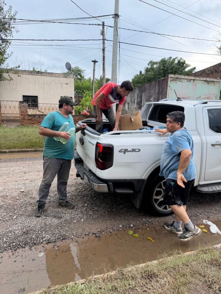 La ayuda incluyó distintos insumos de primera necesidad, entre ellos bidones de agua, lavandina, detergente, espirales contra mosquitos, papel higiénico y otras donaciones destinadas a las familias afectadas por el temporal.